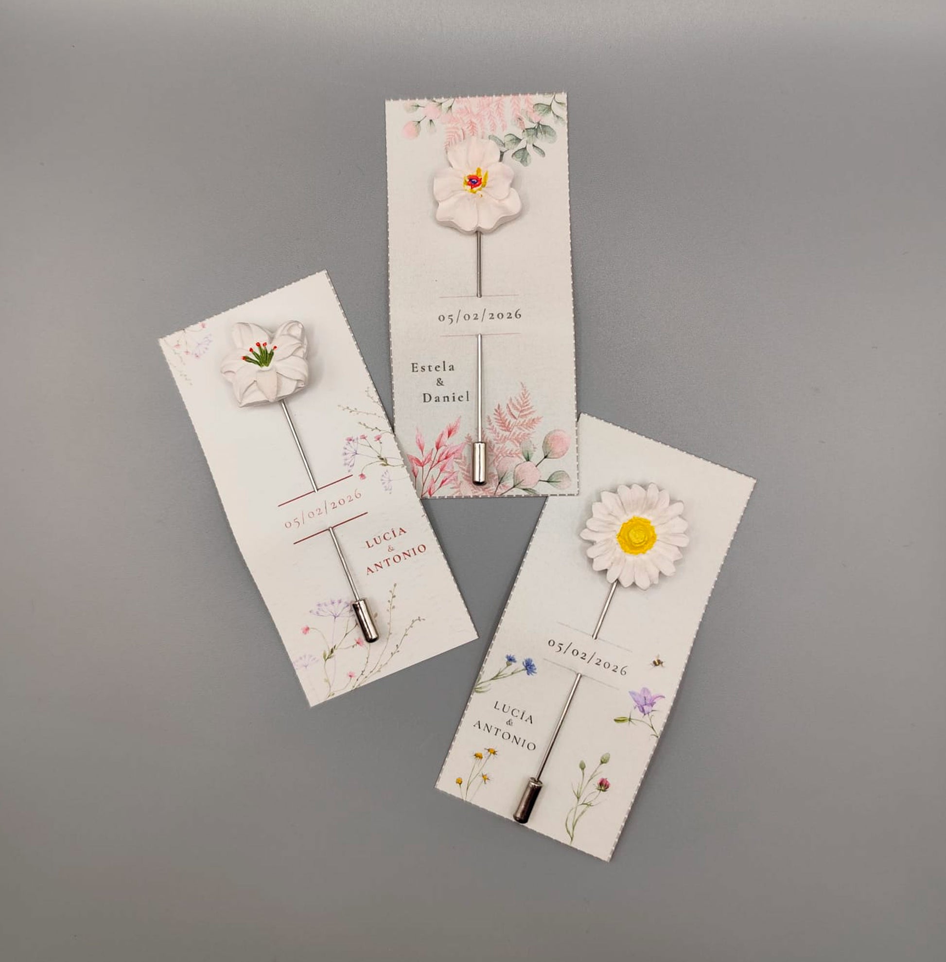 El soporte personalizado con los nombres de los novios y la fecha del enlace convierte este alfiler en un recuerdo inolvidable del gran día.