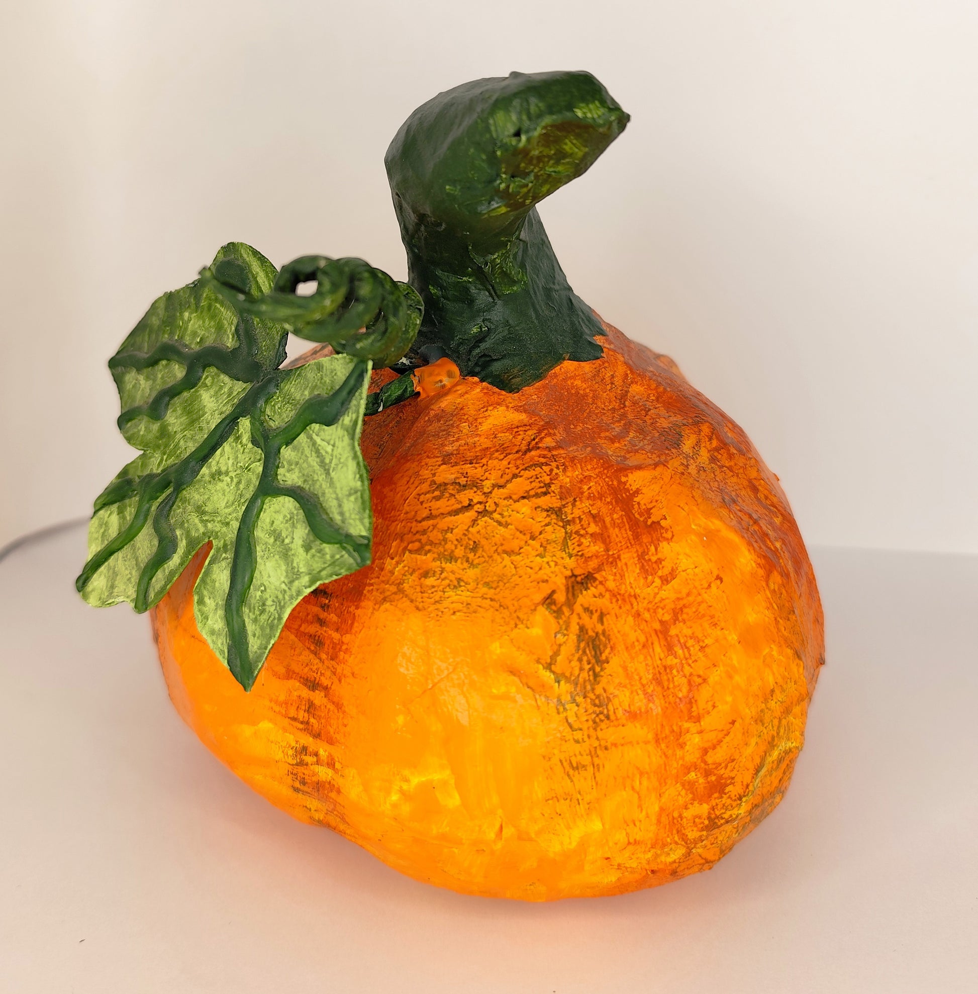 Calabaza decorativa de papel maché, ideal para Halloween o decoraciones otoñales, que añade un toque festivo a cualquier espacio.