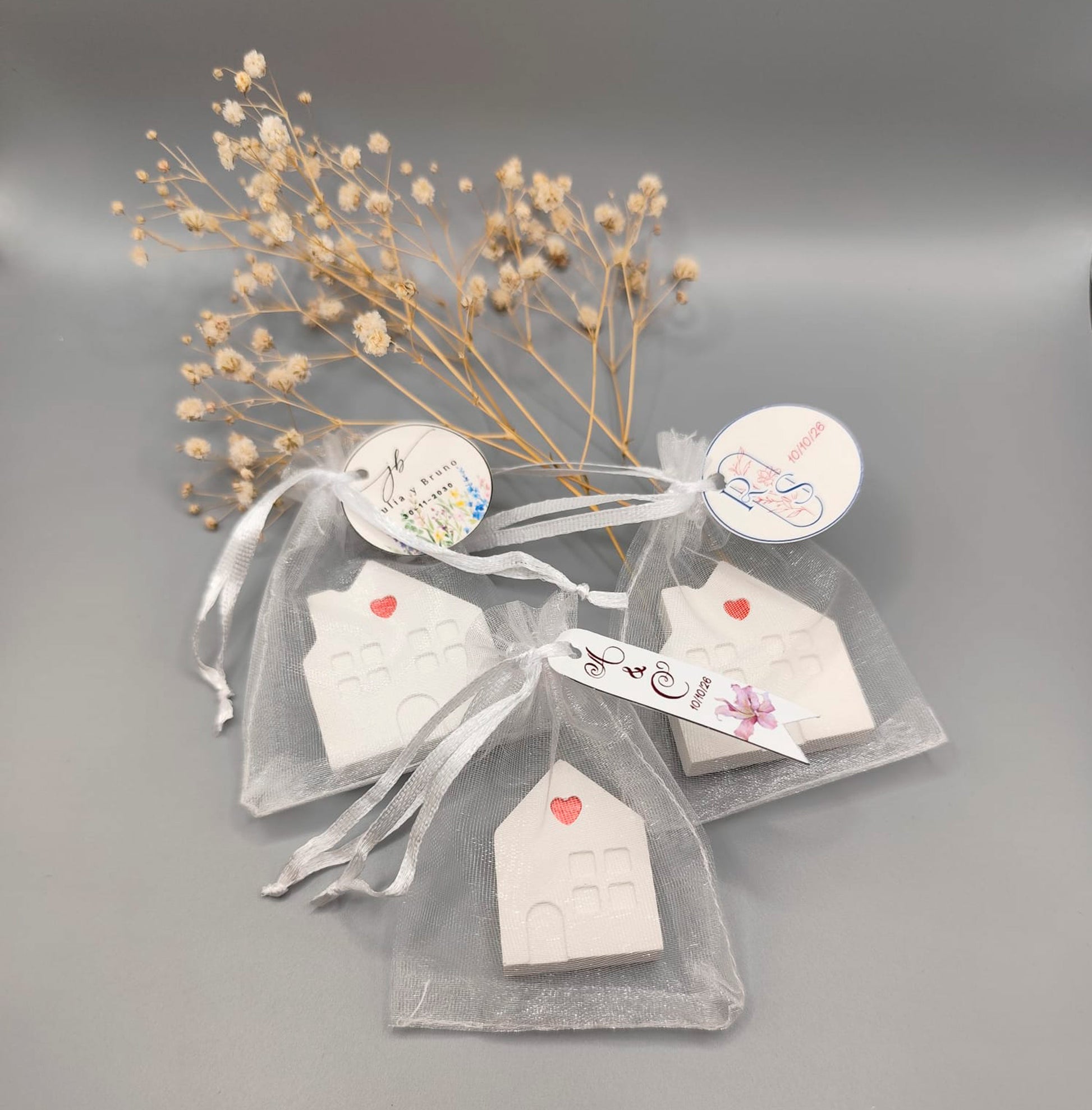 Presentada en bolsa de organza y cartón personalizado con los nombres de los novios y la fecha, convierte este imán en un regalo memorable y lleno de cariño.